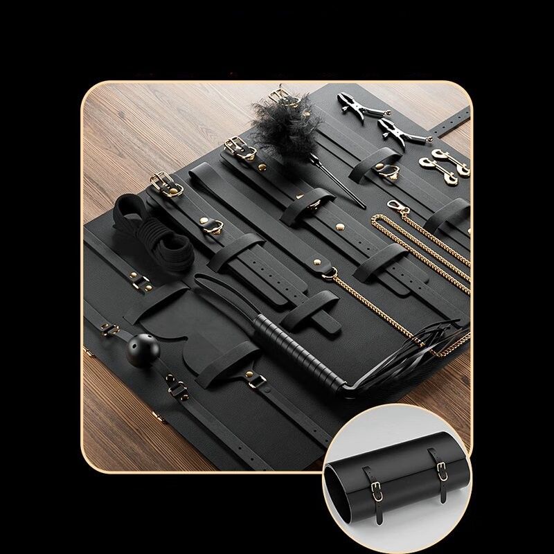 本格的なSMグッズを一式揃えた贅沢な拘束セットです。 手首足首用の拘束具、首輪、目隠し、口枷、鞭、羽根、鎖など多彩なアイテムが専用収納袋に綺麗に収まります。 初心者から上級者まで幅広く楽しめる充実の内容で、様々なプレイシーンに対応可能です。 高品質な素材を使用し、金具部分も丁寧な作りで安心してお使いいただけます。 収納袋付きなので保管も便利で、持ち運びにも最適な本格派セットです。