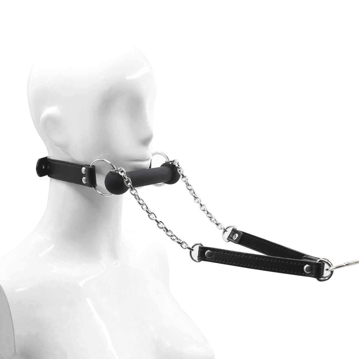 SMグッズとして本格的な拘束プレイを楽しめる口枷です。 首輪と一体化したデザインで、口元をしっかりと固定し言葉を封じます。 金属製のチェーンと調整可能なベルトにより、装着感と拘束力を自在にコントロールできます。 取り外し可能なリードチェーン付きで、主従関係を演出する本格的なプレイに最適です。 耐久性のある素材を使用し、長くお使いいただけます。